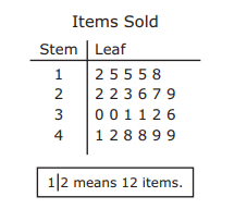 - Q5The total number of items sold by each student who participated in a fund-raiser is shown in the stem and leaf plot. Which statement is best supported by the data in the stem and leaf plot?The number of students who sold more than 30 items is greater than the number of students who sold fewer than 30 items.The number of students who sold between 10 and 20 items is greater than the number of students who sold more than 40 items.The most common number of items sold is 30.The most common number of items sold is 15.60s6.13.A: Measurement and Data