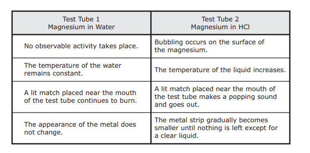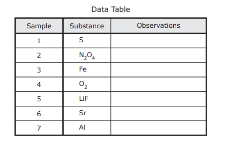 - Q3Some students are using samples of different substances for a lab investigation. They plan to observe the physical properties of each substance and record their observations in a table like the one below. Which of the substances observed are elements?