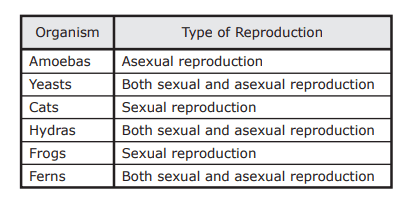 - Q14A group of students prepared a table listing the types of reproduction that occur in several organisms. Based on this information, which of the organisms can produce offspring that are genetically identical to the parent organism?Cats, hydras, frogs, and ferns onlyAmoebas and yeasts onlyFerns onlyAmoebas, yeasts, hydras, and ferns only60s7.13(C)