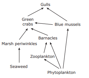- Q1A partial marine food web is shown. Green crabs carry a parasitic worm that can infect organisms that prey on the crabs. Which organism is most likely to be infected by this parasite?Blue musselsMarsh periwinklesGullsBarnacles60s6.12(A)