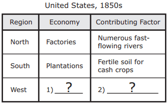 - Q10Which economy and contributing factor best complete this table?1. Large farms; 2. Slaves used for labor1. Cottage industry; 2. Mild weather that attracted immigrants1. Mining; 2. Metal ores and minerals1. Ranching; 2. Railroads to transport cattle to market60s8.12.D: Social Studies - Economics