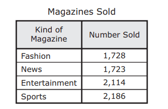 - Q8The table below shows the number of each kind of magazine sold in a store during one month. Which list shows the kinds of magazines in order from greatest to least number sold?Fashion, sports, entertainment, newsSports, entertainment, fashion, newsSports, fashion, news, entertainmentFashion, news, entertainment, sports60s3.2.D: Number and Operations