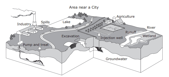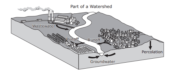 - Q3A student drew the model below to represent a part of a watershed and some human activities that affect the watershed. How do the industrial, agricultural, and residential activities of humans most likely affect the groundwater in the area?The activities prevent most of the water from evaporating into the atmosphere.All of the abovePollutants from the activities percolate through the soil and enter the water table.The activities replace the groundwater used.60s7.8c